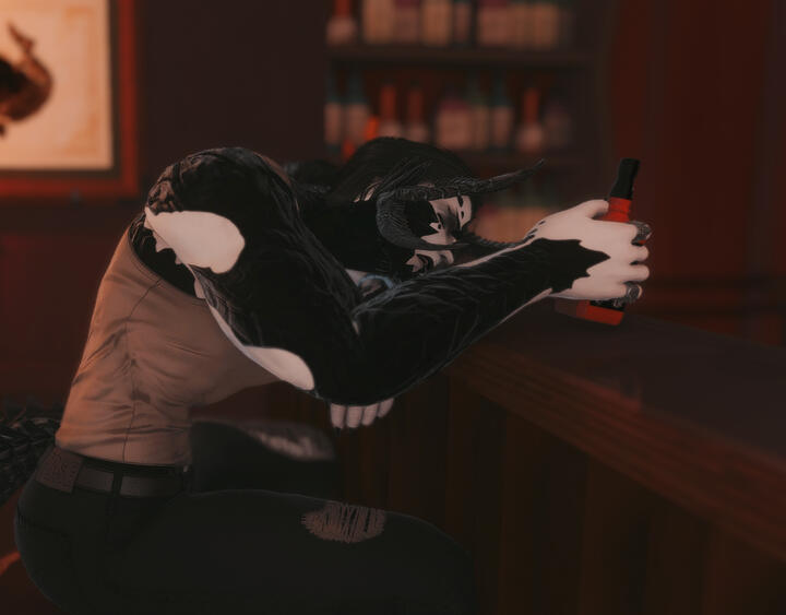 V’nuvi approaches you sitting alone with a crisp cold beer with a thin layer of foam on top. He sets his cup on the nearby table and taps your chest with his free hand. “Come on, you’re not allowed to be upset while I’m here.” He extends his arm out to you and offers the mug. When taken he sits down beside you. “You know all these people in there having a good time, why not you huh?” His tail raps on the seat making a thud. “No good answer huh? I’ve been there. All I needed was a hand to get going.”