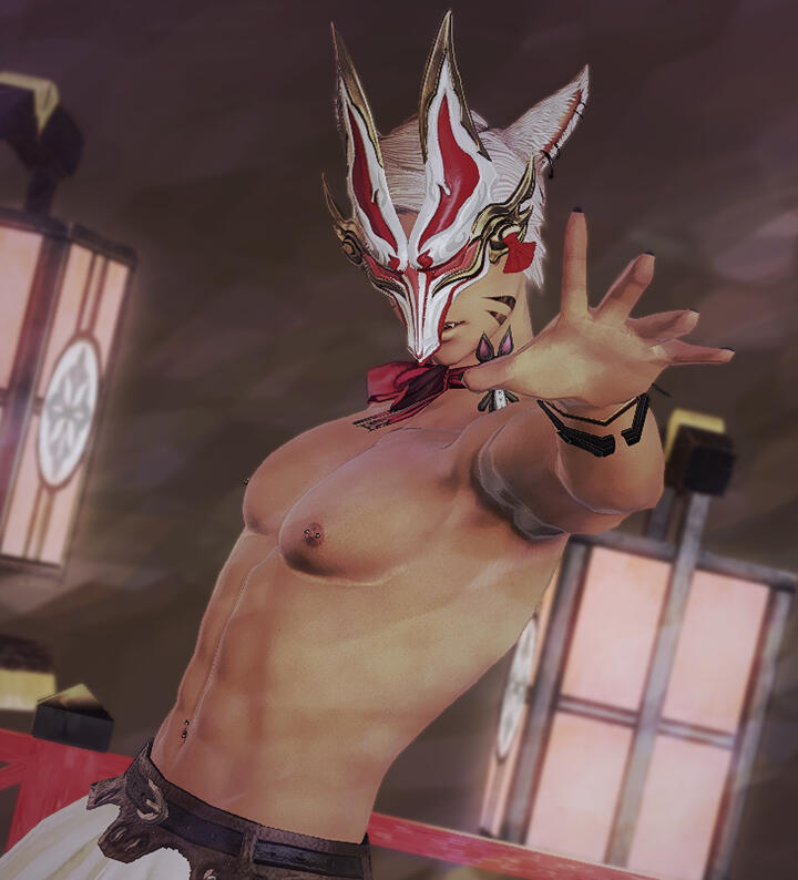 The red glow of paper lanterns reflected off the white hair and fur of smaller then average Miqo'te, Their unusual eye colors and scars painting a striking first impression, "My my now who are you to be wondering about so late at night?" Their voice matching their more femine frame, soft and high sound more like they were purring then speaking. They looked upon the stranger with eyes that spoke mishief and promised passion.