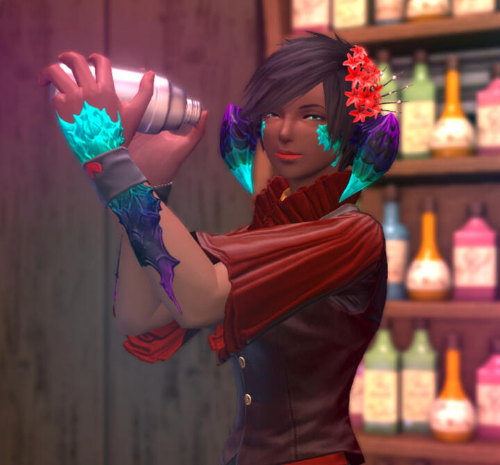You approach the bar, watching the short Au Ra wiping down the table with a damp cloth. As you move the stool, the noise attracts her attention. “Welcome in! What can I get ya today?” Her smile seems almost as bright as her scales as you glance from her to the menu she slides over to you and back. “My personal favorite is the Cafe Martini, but I get it if it’s not everyone’s cup o’ joe!” She laughs a little to herself as you can feel yourself let out a little snort at her playfulness.“One Rum Punch and a Takoyaki coming right up!” she calls, her voice upbeat. You watch as she flips on the heat beneath a pan with little divots, then grabs two bottles of rum from the shelf. Standing on her toes, she reaches into the icebox and pulls out three different fruit juices. With a fluid, practiced motion, she fills the shaker with ice and pours each of the five ingredients in, one after the other. She secures the lid, giving it a quick shake and flashing a grin your way. “This is my favorite part!” she says with a twinkle in her eye. A moment later, she strains the vibrant concoction into a chilled hurricane glass, topped off with a tiny sailor hat. She slides the drink over to you with a flourish. “Takoyaki’s gonna be done in a flash! Had to heat up the pan.”The meal was delectable and the atmosphere quaint. You look back to see Lauriam doing the same thing you saw her doing when you walked in, though she was looking right at you. “You enjoy yourself? You seem to have gotten your fill! Well, I hope to see you again cutie.~” You have a sneaking suspicion that you will be back here again…