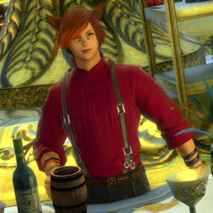 Aldaros was born in Kugane, adopted by two au ra, then moved to Gridania. In his early days, he spent much time learning how to cook with his mother, a Xaela from the steppe, and "foraging" for ingredients of which his mother could use to cook. This "foraging" is what earned him his face scars. His mother dearly appreciated the effort.As he got older his Father, a Raen, would tell him stories of his home and the many hunts he accepted during his time in Kugane. Aldaros, inspired by the heroism and many tales of battle, changed his goal from being the worlds best cook to also include being a great hero to the people just like his dad. As soon as he was old enough, he BEGGED his parents to let him sign up to the Adventurer's Guild in Gridania's hub.Nowadays, between his time as an adventurer, he travels the lands to any town/city/village/establishment he can possibly find to obtain recipes to bring home and try out for himself... Jazuba is no exception!